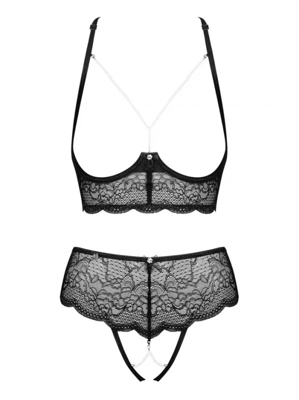 Комплект с жемчугом "Obsessive Pearlove Set" открытый лиф и трусики с доступом, черный, L/XL